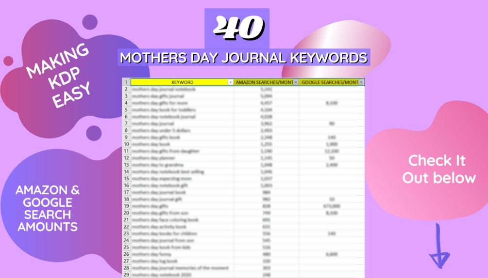 Get 40 Mothers Day Journal Keyword Search Terms and number of search for both Amazon and Google. The easiest way to get started with putting out Mothers Day Journals.